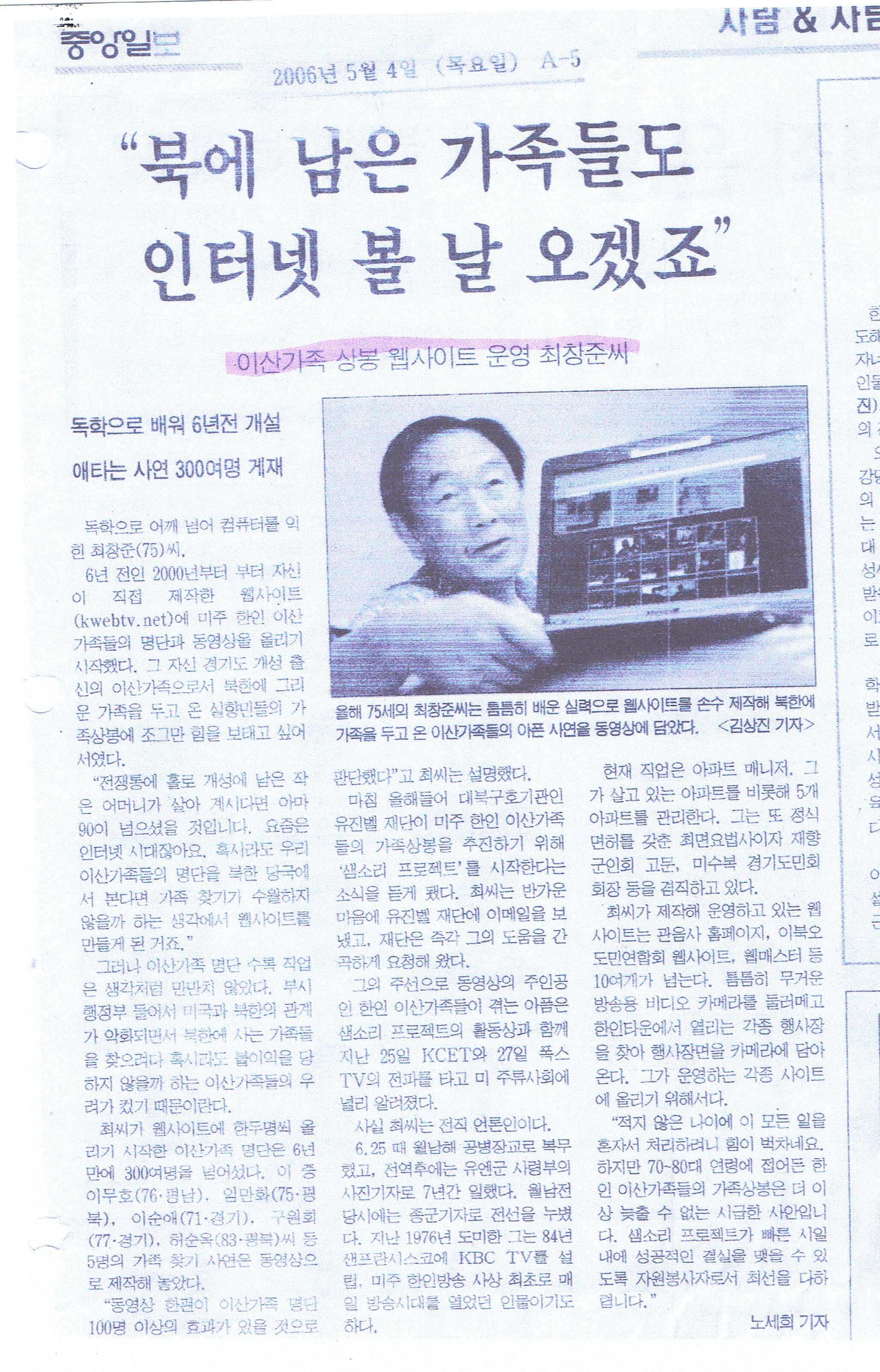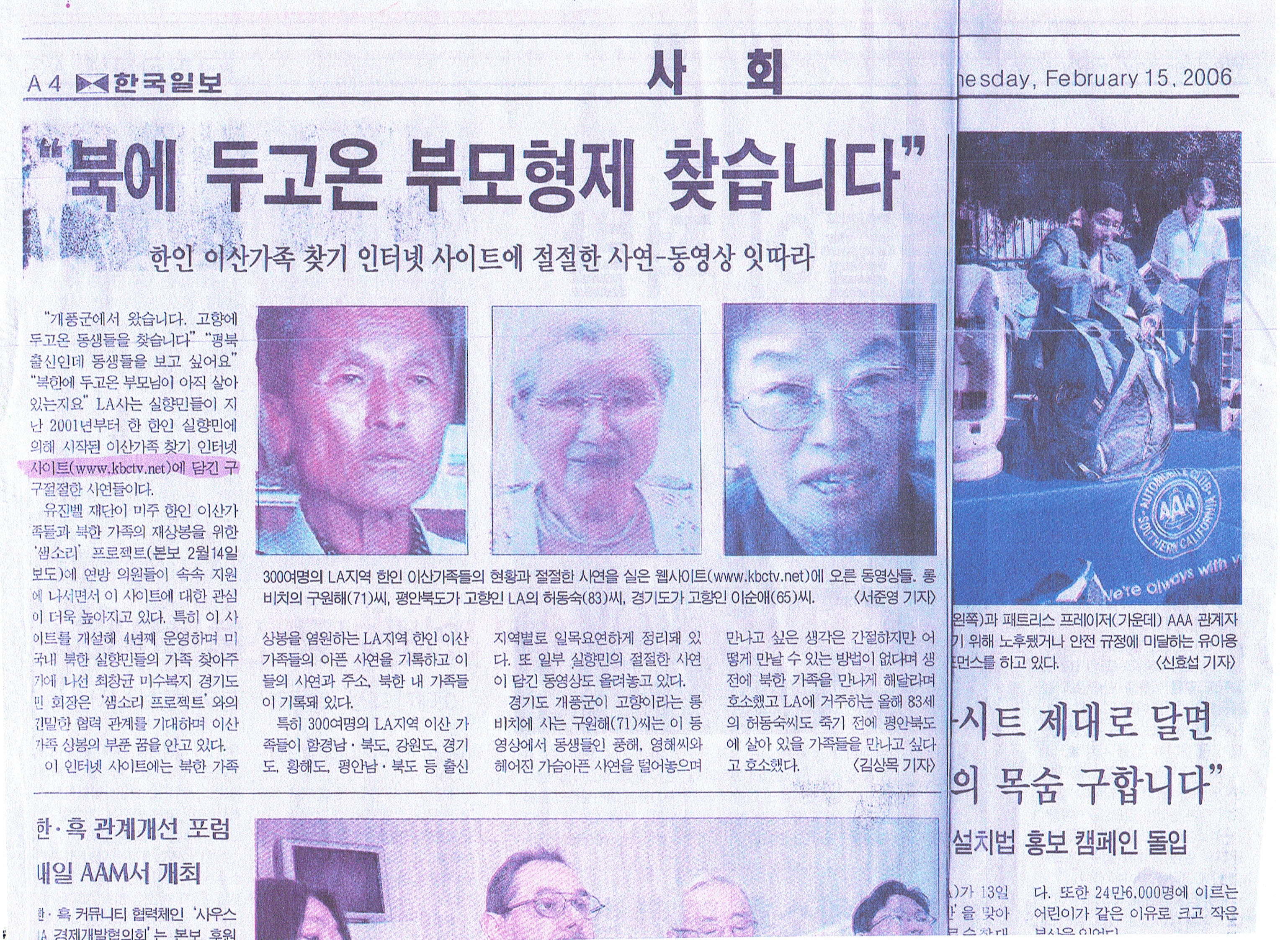 2006년 2월15일 ” 북에 두고온 부모형제 찾습니다” 기사
