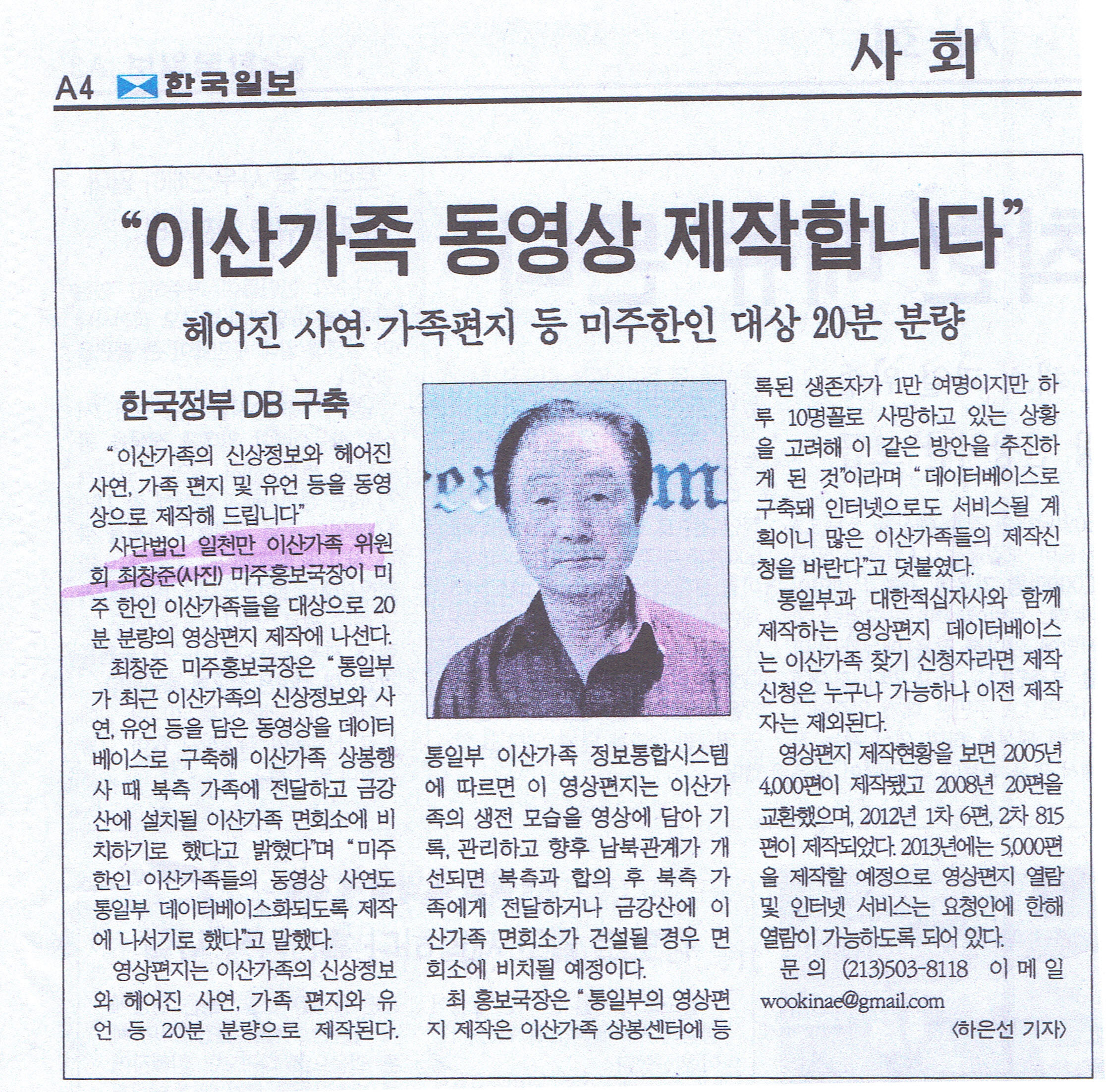 “이산가족 동영상 제작합니다” 한국일보 기사